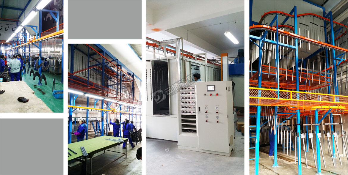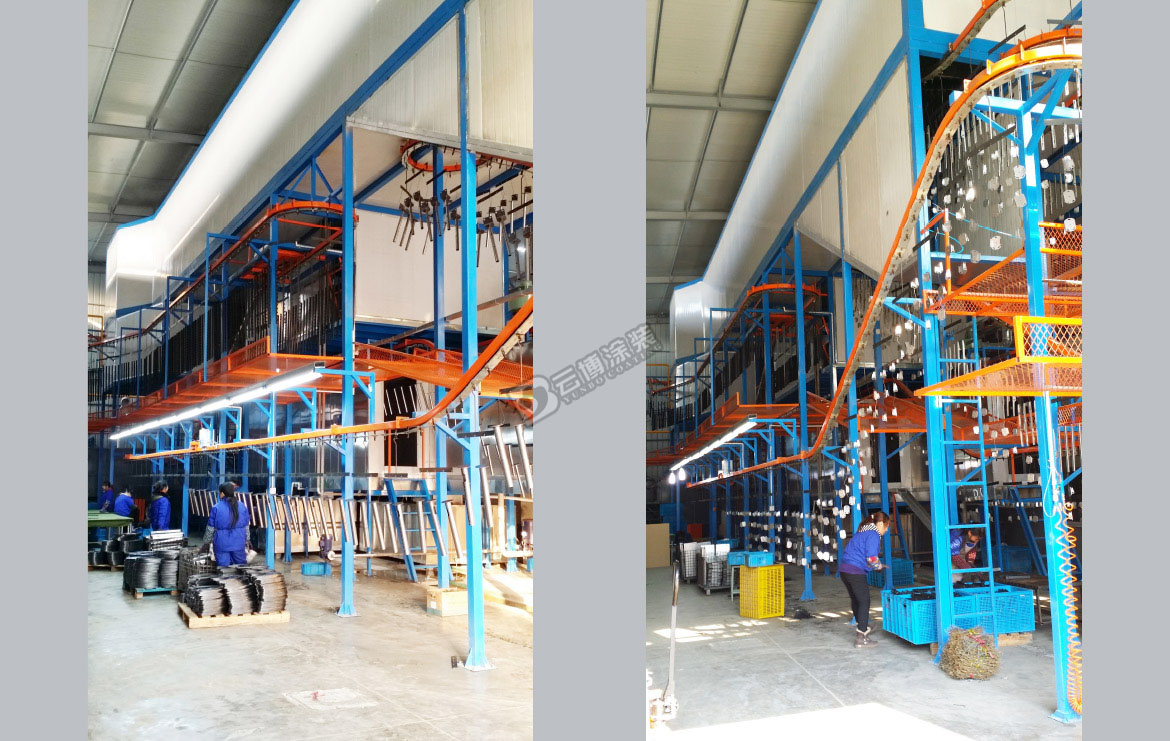 此涂裝線為電視機支架的全自動涂裝線,采用噴淋+游浸結合的前處理工藝,此線采用立體空間布線,上下三層設備,設備最高點11米高,大大節省了設備安裝空間。